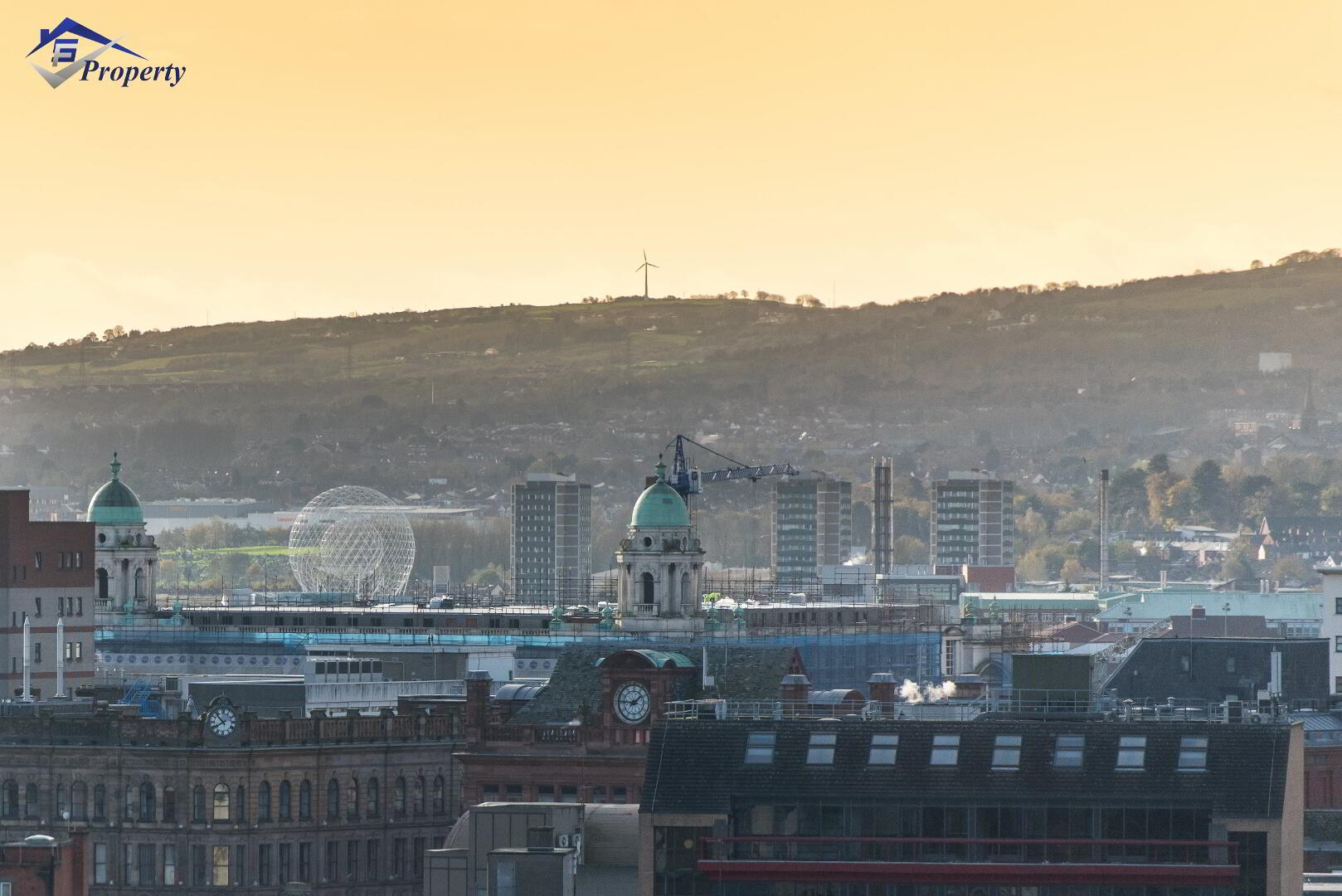 Spacious living area designed to allow lots of light throughout much of the day, together with uninterrupted views of the city and neighbouring hills. The Mourne Mountains can also be seen in the far distance beyond and to the right of the Waterfront Hall