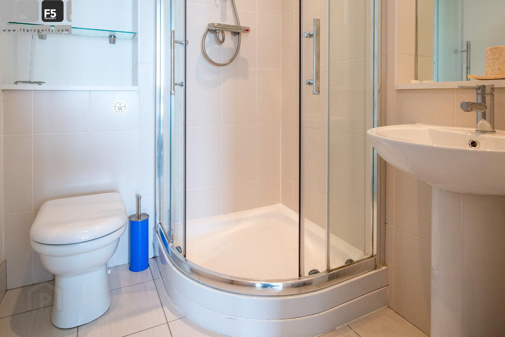 Large carpeted double bedroom with metal-framed double bed, spacious wardrobe space and a spacious and contemporary en-suite shower room with white sanitary-ware, complemented by chrome fittings, large wall-mounted mirror and heated brushed chrome towel radiator