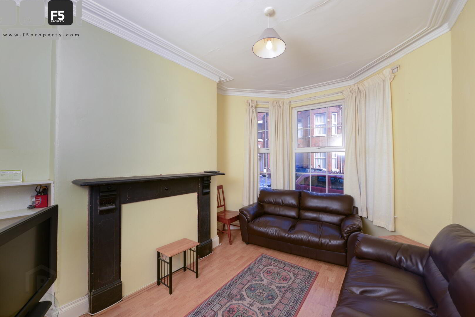 Bright and spacious lounge with laminate wood flooring. Leather sofas