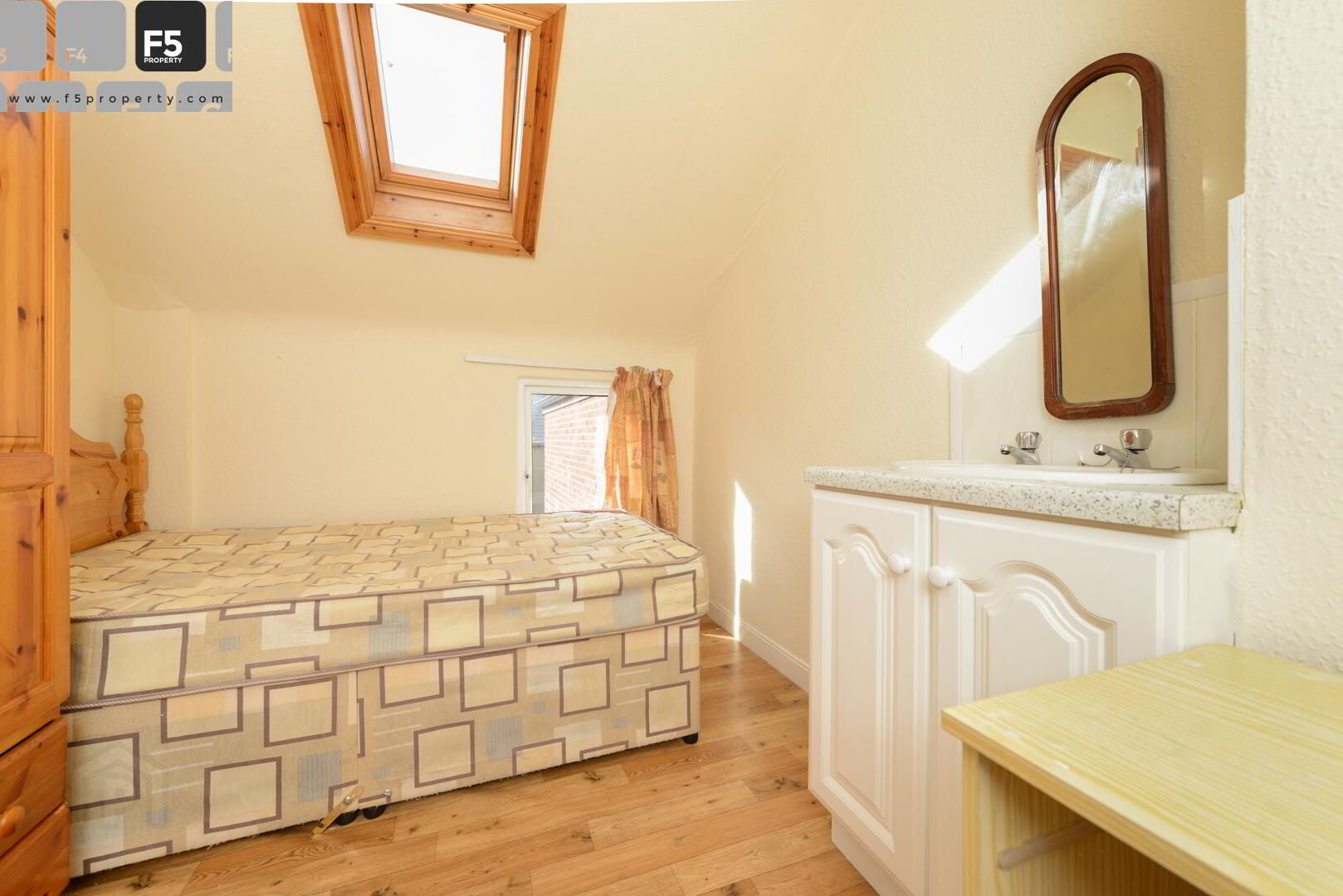 Double bedroom with laminate wood flooring, sink & vanity unit, double wardrobe and chest of drawers