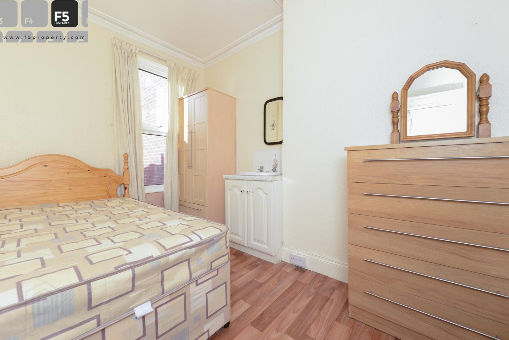 Large bright double bedroom with laminate wood flooring, double wardrobe, chest of drawers, sink & vanity unit