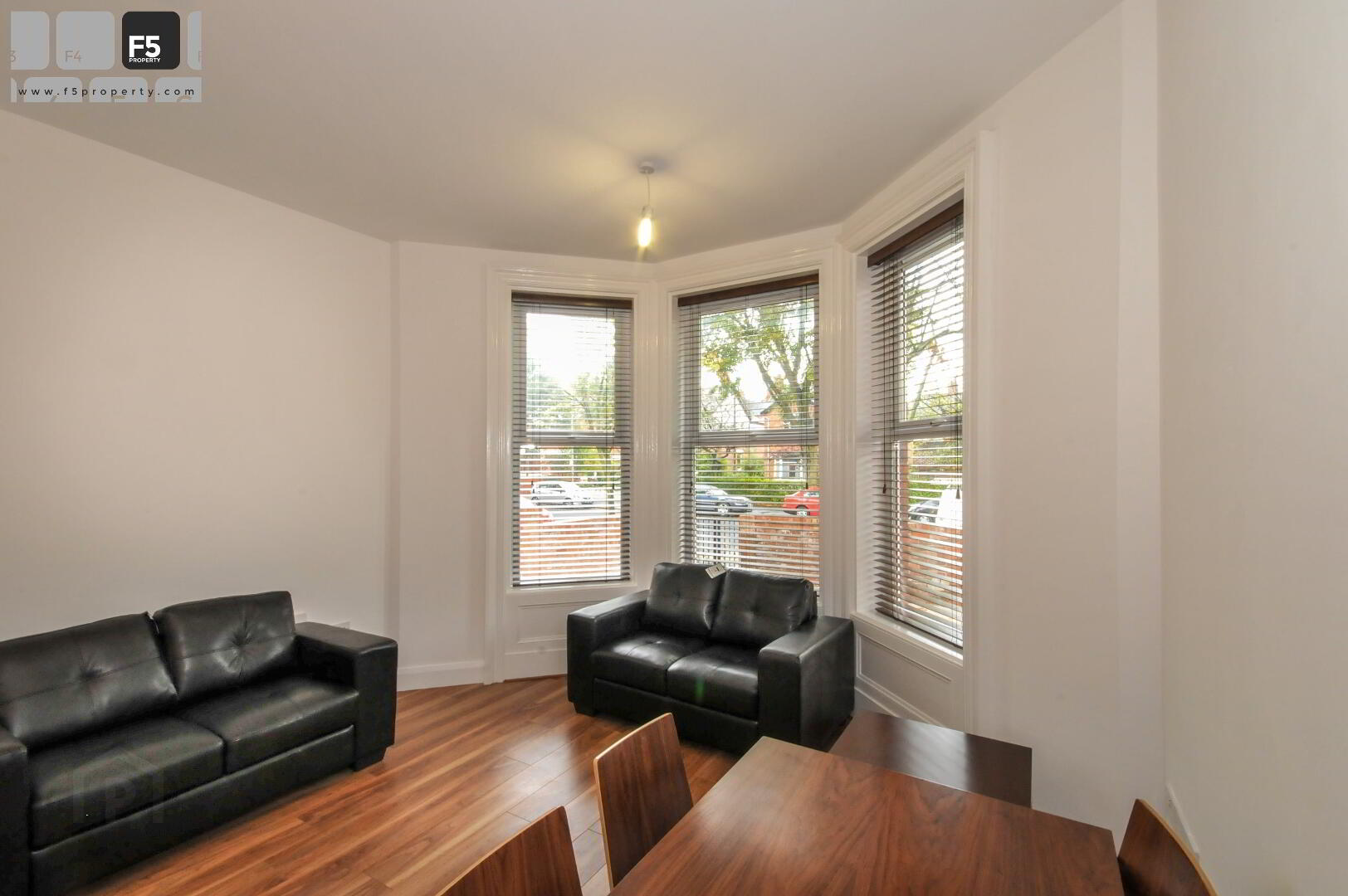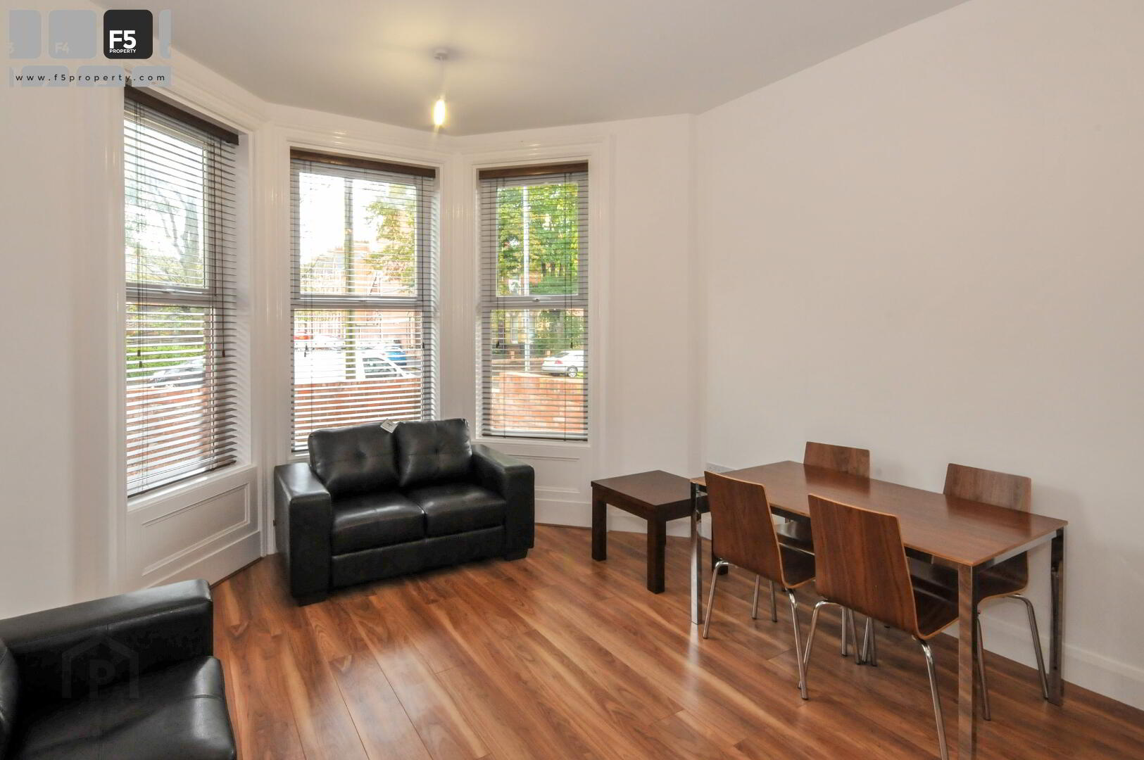 Spacious lounge dining room featuring tall sash windows overlooking a walled paved area to the front of the property. High quality laminate flooring. Wooden venetian blinds. Table and four chairs. Two 2-seater settees