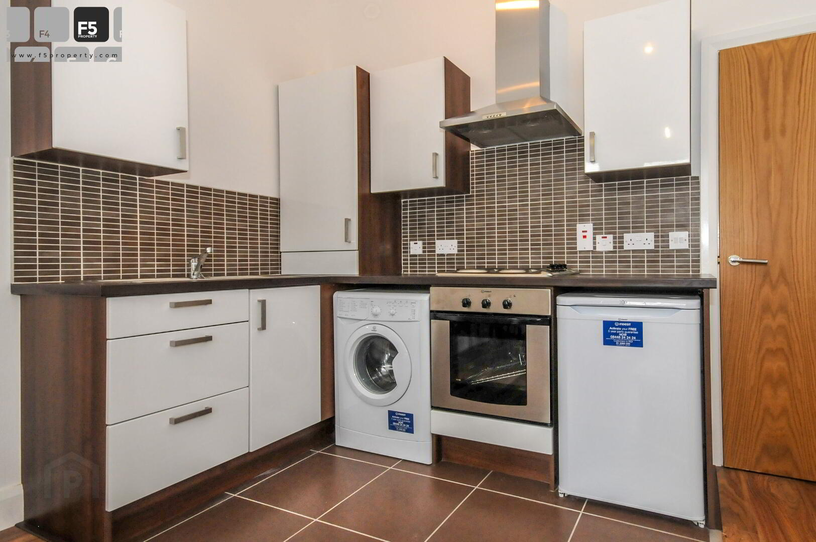 Range of high and low-level units. Stainless steel electric oven, hob and extractor fan. Tiled floor and splashbacks