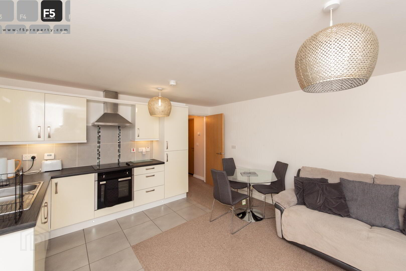 The kitchen has cream cabinets with plenty of storage, black worktops, and a stainless steel bowl-and-a-half sink with a mixer tap. It comes with an integrated oven, hob with extractor fan, fridge, freezer, and washing machine. It has tiled splashbacks with a strip of mosaic tiles and tiled flooring, plus under-cabinet lights for better visibility.
