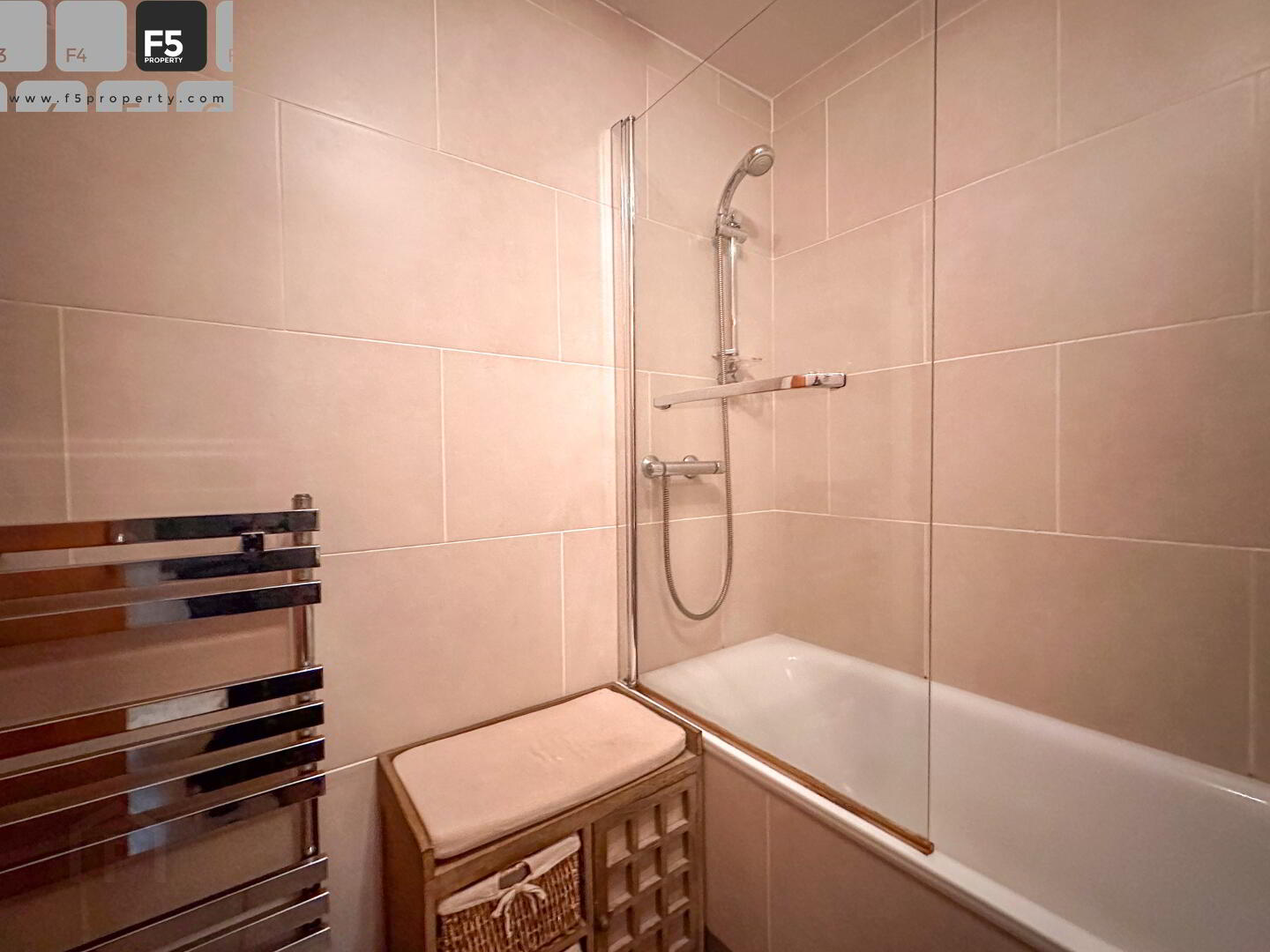 White bathroom suite, fully tiled walls and floor, chrome heated rail and extractor fan