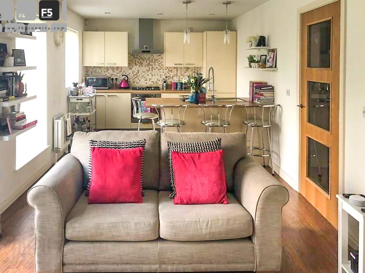 Radiator, modern electric fire, doors to communal garden, television, satellite and telephone points, modern range of high and low cream gloss units with wooden effect worktops, mosaic tiled walls, integrated electric oven, 4 ring gas hob, extractor hood, dishwasher and fridge freezer along with a large island unit with sink and storage